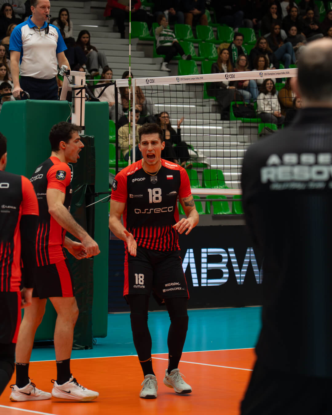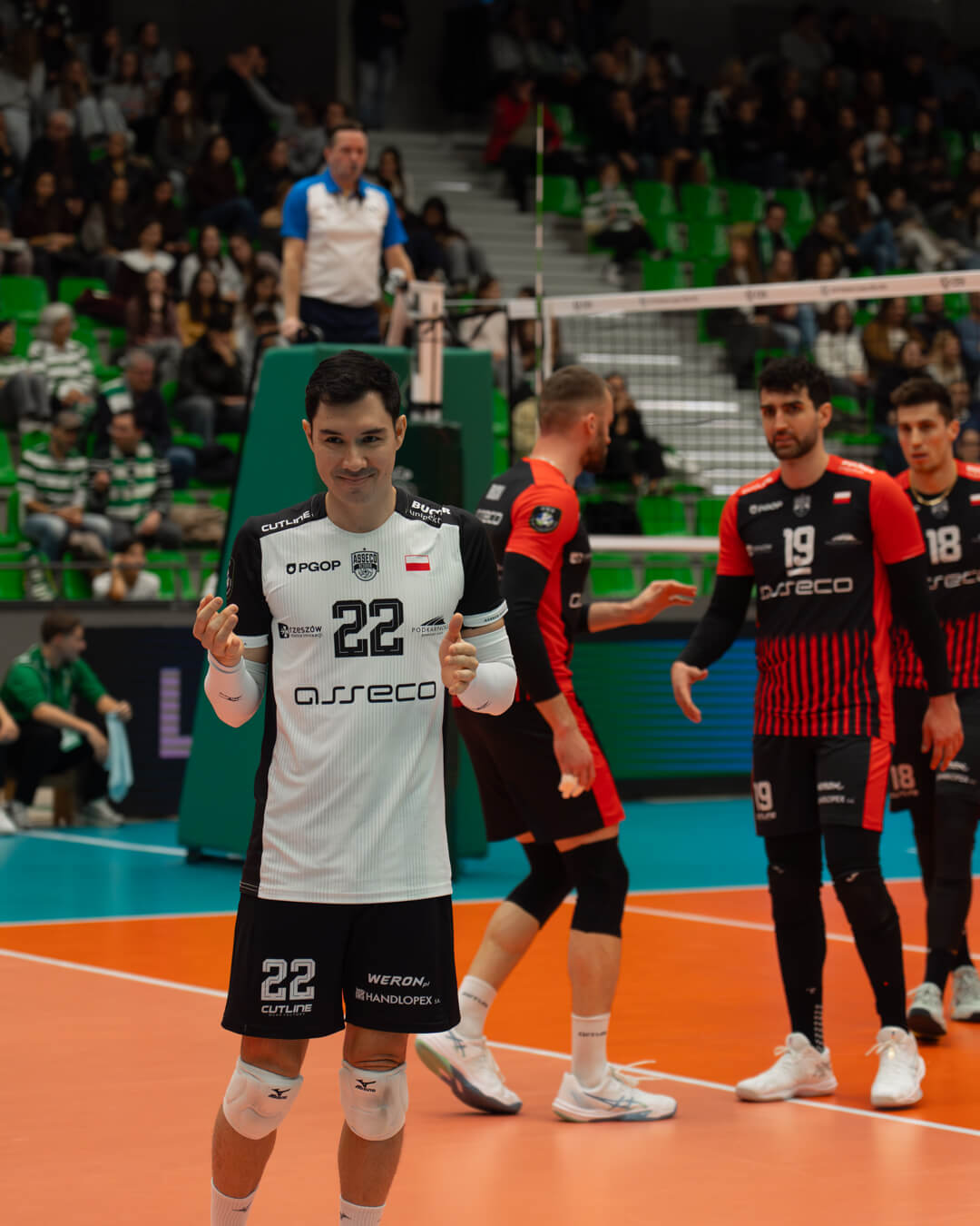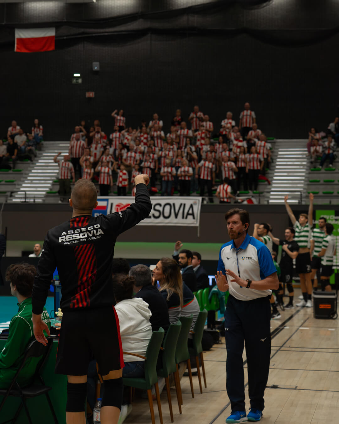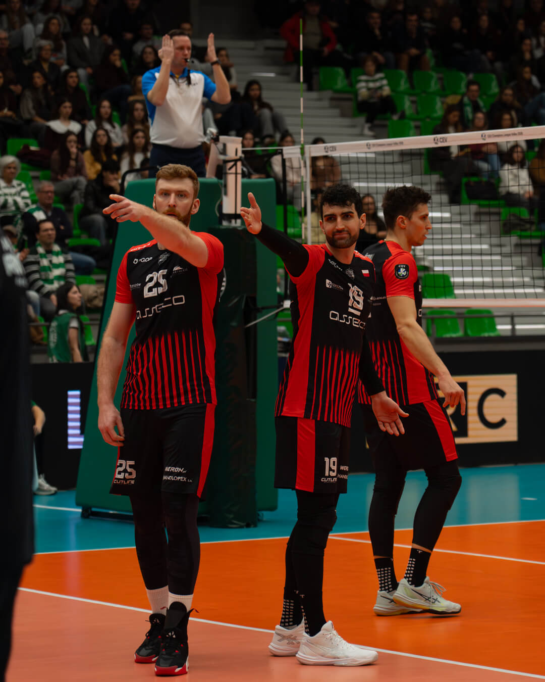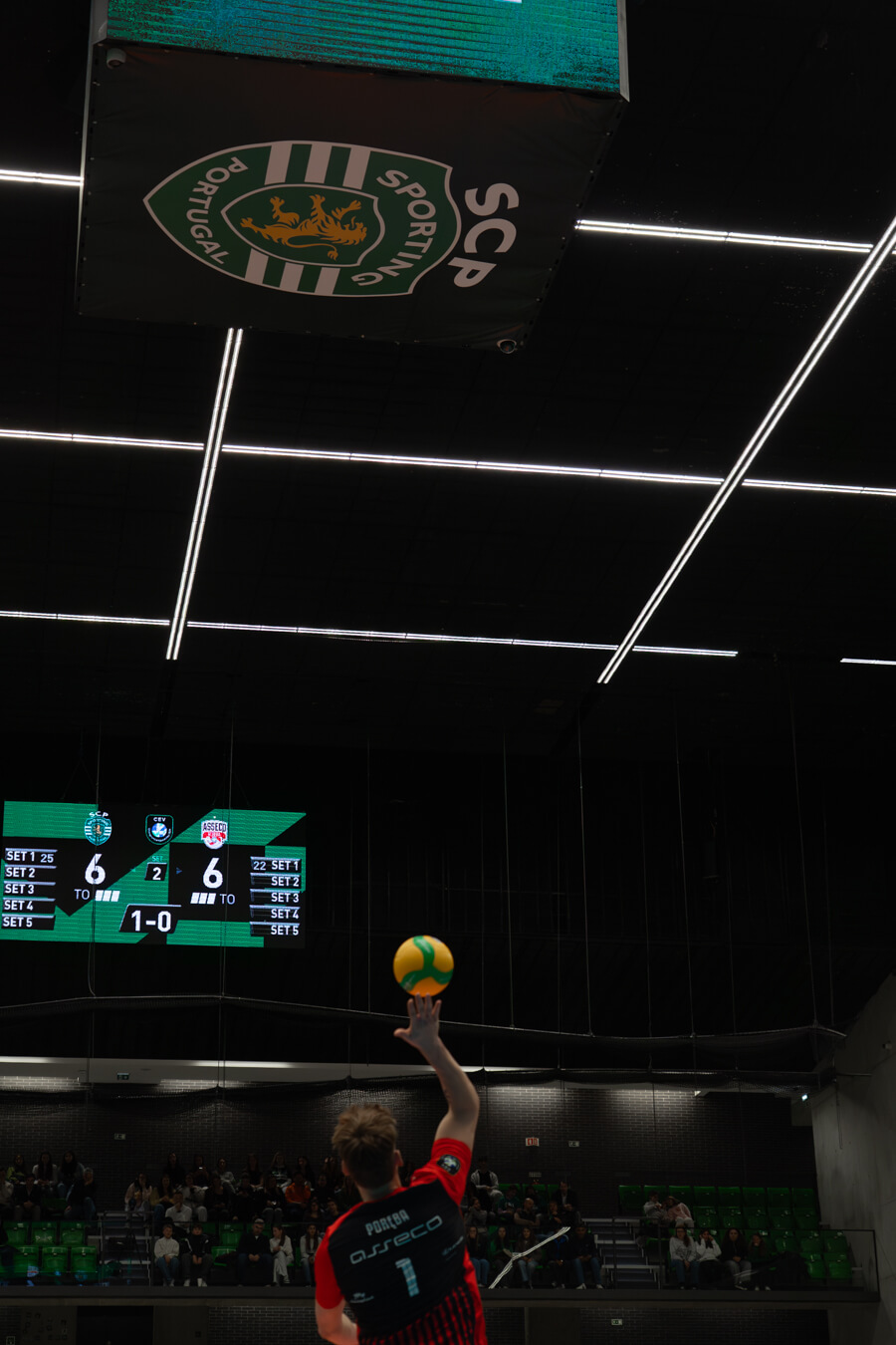 Spotkanie w Lizbonie od początku miało wyrównany przebieg. W pierwszym secie oba zespoły długo grały punkt za punkt, jednak w końcówce więcej skuteczności zachowali gospodarze, którzy zwyciężyli 25:22. Druga partia wyglądała bardzo podobnie – rzeszowianie starali się przejąć inicjatywę, lecz ponownie to Sporting lepiej rozegrał kluczowe akcje i objął prowadzenie 2:0 w meczu.